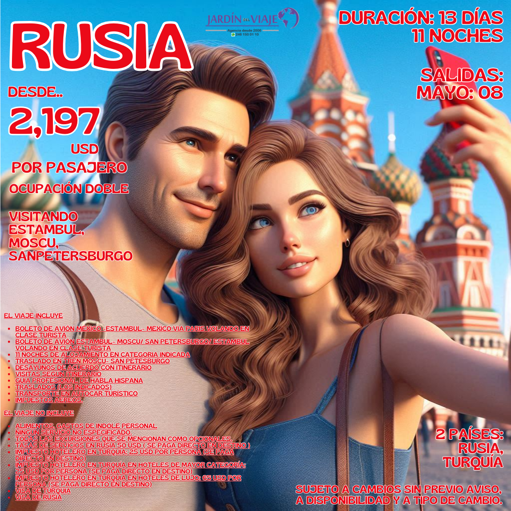 RUSIA Publicado porJardín del Viaje28 de febrero, 202524 de marzo, 2025Publicado en Europa, Publicaciones D Comparte esto: Compartir en WhatsApp (Se abre en una ventana nueva) WhatsApp Imprimir (Se abre en una ventana nueva) Imprimir Enviar un enlace a un amigo por correo electrónico (Se abre en una ventana nueva) Correo electrónico Me gusta Cargando... Relacionado