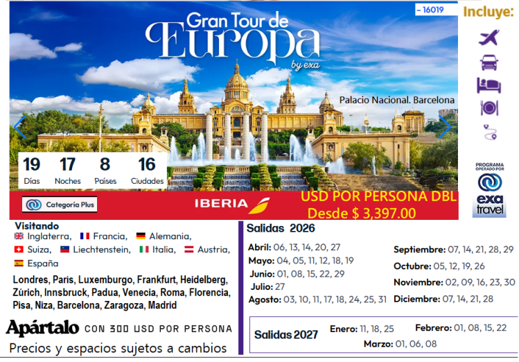 - El seguro turístico incluido cuenta con cobertura mínima para Europa. Si usted lo requiere, puede adquirir un seguro de mayor cobertura; consulte a su agente de viajes.
