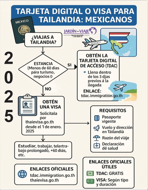 - Más de 60 días o propósito no turístico (estudiar, trabajar, teletrabajo prolongado, etc.) → sí necesitas visa y se tramita 100% en línea por thaievisa.go.th. Desde 1 enero 2025 todas las solicitudes se presentan por e-Visa. Tiempo típico de proceso: hasta 5 días hábiles. สถานเอกอัครราชทูต ณ กรุงเม็กซิโก
